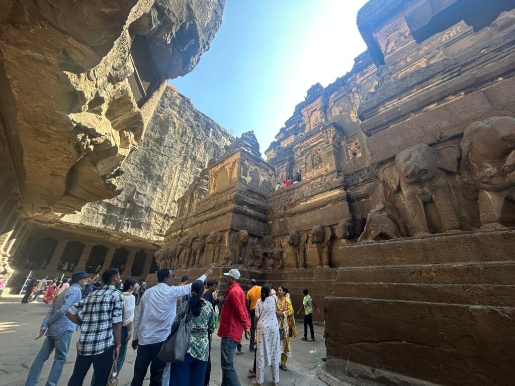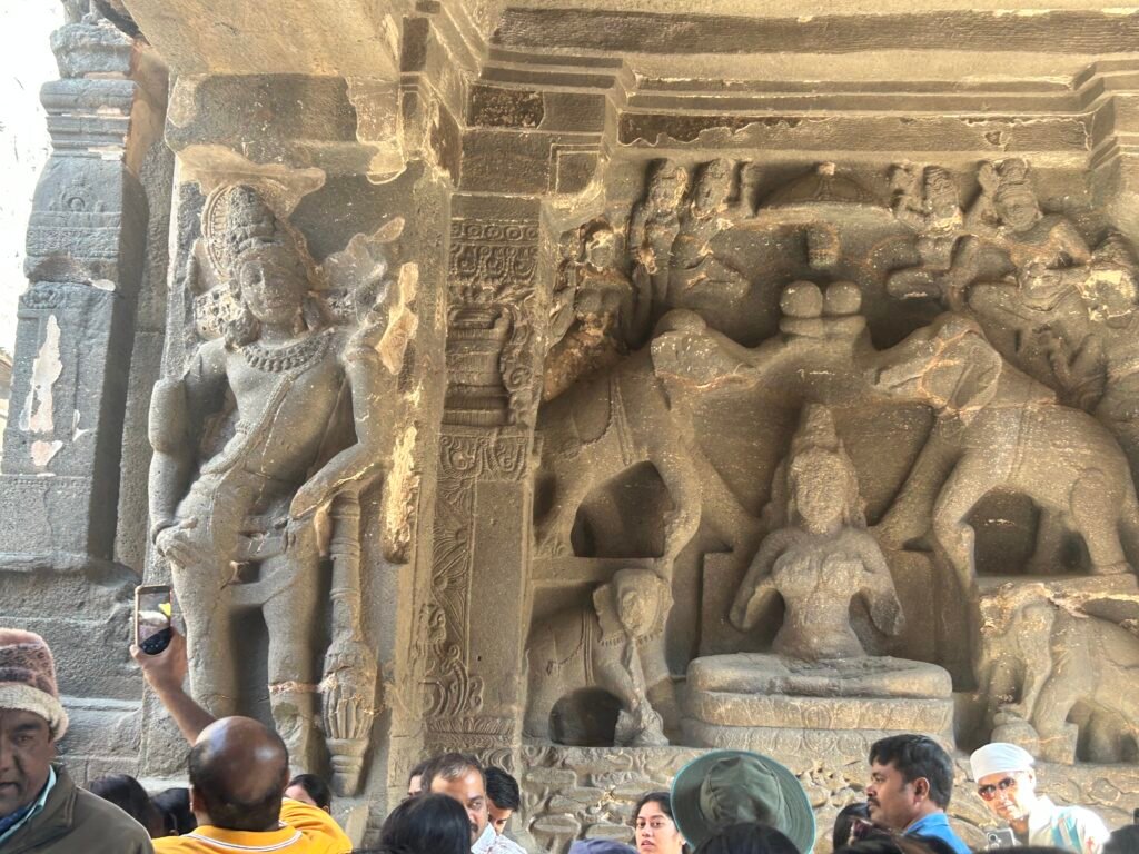 Spend some 2 hours at the cave number 12. Then exit from the same point and have a nice lunch at Kailasha hotel which is government run eat place. As I entered the Cave 16, was awed by the magnificent rock statues size and finesse! The more I walked around exploring the huge cave complex – the beauty and size and the grandeur bewitched me! Just kept wondering, that it takes gigantic, imported machinery today by Indians to make a simple bridge on mountains, or even drilling into a tunnel. How on earth did the Indians make this monolithic largest cave temple in World during 6 and 12 CE!? What did they have which we don’t have today? Were the ancient men more advanced and creative and competent than mankind today in the ‘AI era’!? All these mystical questions, while in a daze looking at the statues, I didn’t realise 2 hours had passed just in the Kailasha Cave!