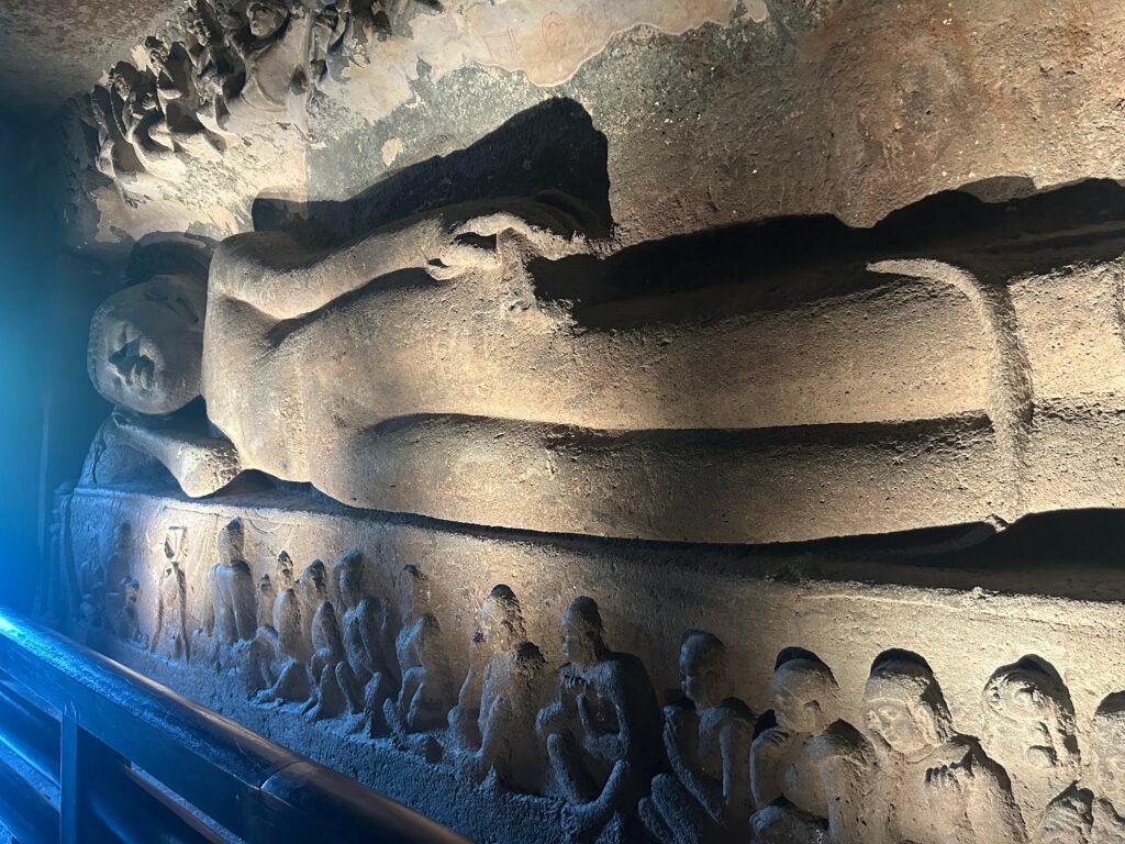 Then comes sunlight and its angle of incidence on these caves. The caves are dark! So dark that you need a torch light to see the paintings. Though torch and flashlights are prohibited now in these caves to preserve them. So the paintings could be made by the local artisans by using a burning flame. But then the soot of the flame deposits would leave a thick deposit on these paintings too unfortunately! There too some divine presence works her hands 😊 . The sunlight penetrated directly into these caves on three periods through the day and it was synced accordingly by the locals for finishing the carvings and paintings. These could not be be done post sunset. There is another similar valley site nearby the Ajanta (as shared by my guide) , however which could not be used for the lack of these 3 divine interventions!