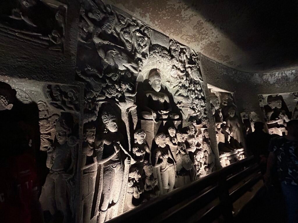 The Ajanta cave temples (some 32 in count, however only 26 open for tourists), were built over 96 years in different phases by different dynasties in India . These were built by the kings initially to spread buddhism to common folk and the practices of ‘Dhamma’. We also see Jain and Hindhu paintings and sculptors here . This proves that India was pluralistic then. End of every era or death of a king led to incomplete cave temples (as we would see interestingly)! Every new ordained king started creating a ‘new cave’ ! Hence so many caves 🙂