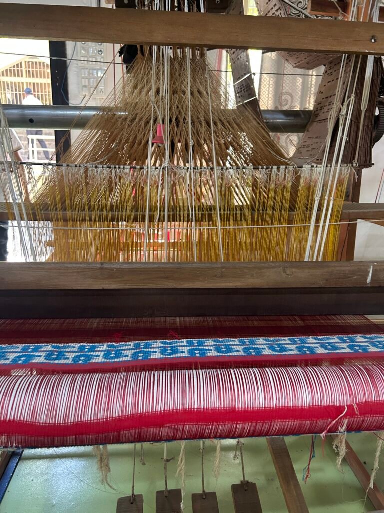 There are bunch of pre formatted blocks appearing on the top of the loom , against which the silk threads goes weaving upon by hand . On the picture in the opposite side of the fabric….the real motifs comes on the underside !