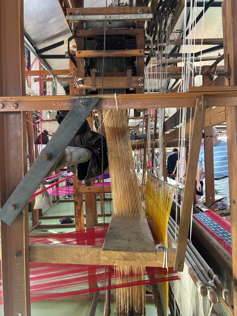 A complex network of countless threads on a equally complicated handicraft machine …being worked upon by quick fingers of both hands by men and women ……amazing site!